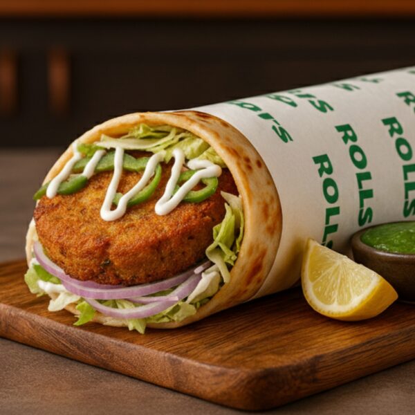 The Tikki Tango Roll is a delicious aloo tikki roll stuffed with crispy potato patties, fresh veggies, and chutneys, wrapped in a soft bread for the perfect snack. It’s one of our most loved veg rolls at Rolls Bar.
